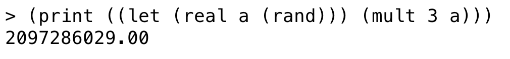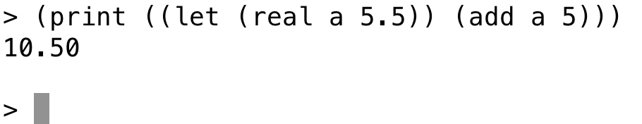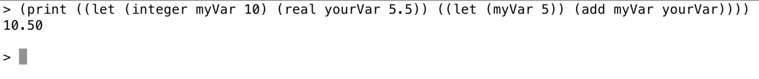 There are two types in ciLisp. They are real and integer. Integer is your typical integer and real behaves as a double. Variables must be initialized and declared with desired types before they can be used. Variables are coerced with the following rules: