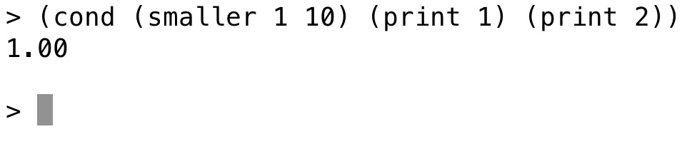 The cond function checks to see if the first expression evaluates to true (non-zero). If so, the second expression is evaluated and returned. Otherwise, the third s_expression is evaluated and returned. The conditional functions equal, smaller, and larger all return 1 if the condition holds and 0 otherwise.